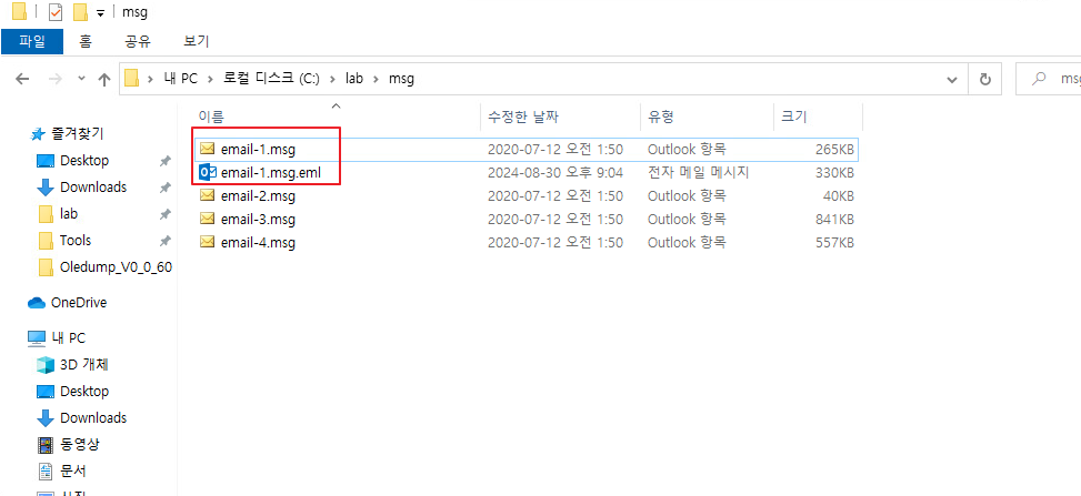 일반 텍스트 형식으로 출력되는 내역 msg2eml 툴을 이용하여 분석할 msg 파일을 eml 형식으로 변환하였다.