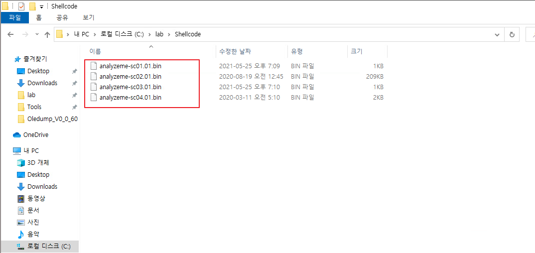 분석 대상 파일 결과 이를 통해 위 4개의 쉘코드들이 어떠한 API를 이용하는지 확인 할 수 있다.
