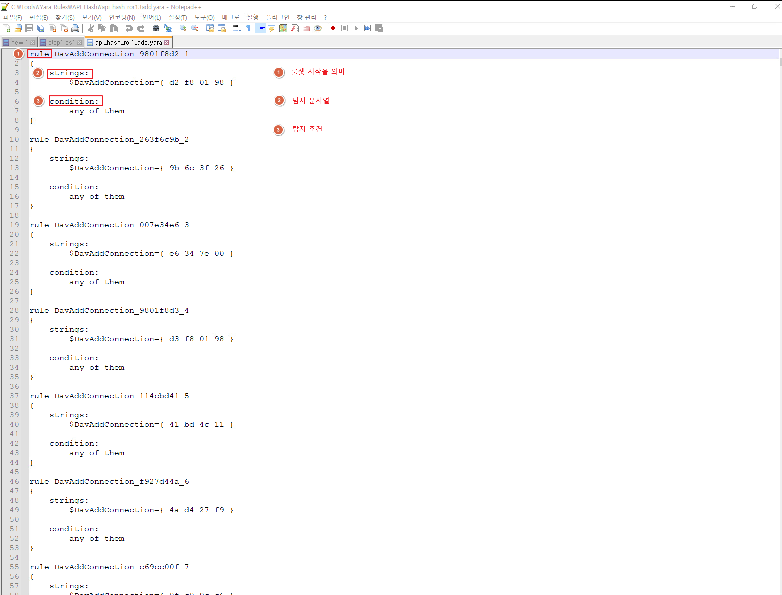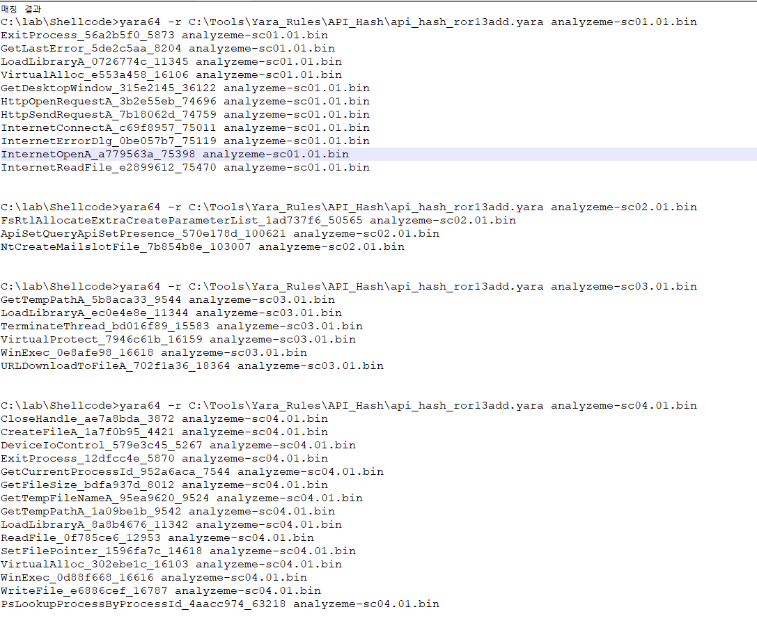 그렇기에 apirule.yara 파일은 여러가지 해시 함수에 대한 결과를 가지고 있는 파일, api_hash_ror13add.yara 파일의 경우 ror13add 해시 알고리즘을 이용하여 API 해쉬화한 패턴들에 대해서 가지고 있는 파일이다.