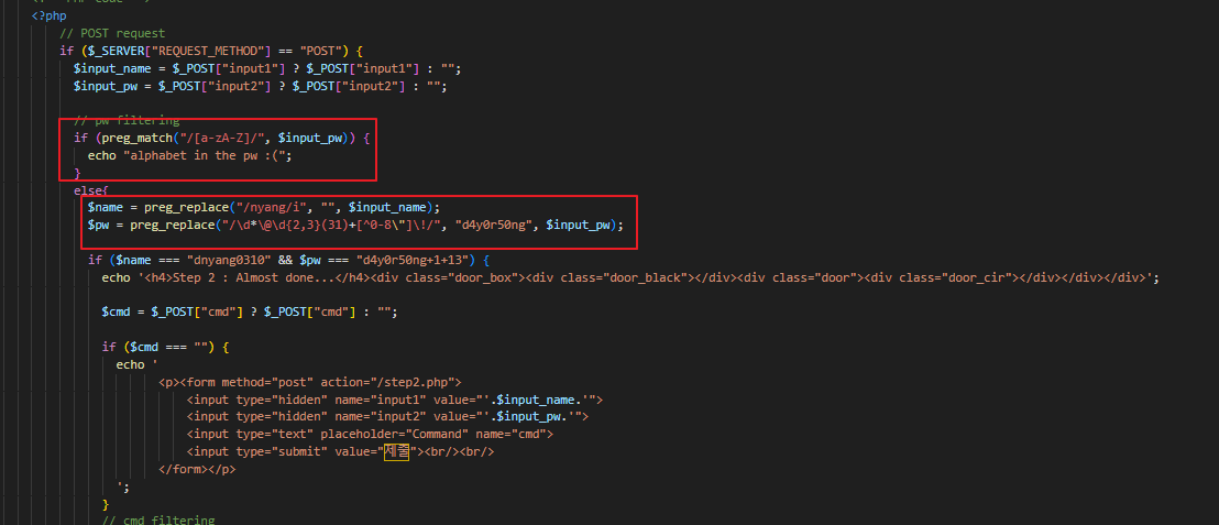 4. 이렇게 두번째 단계로 넘어올 경우 System() 함수를 이용하여 ../dream/flag.txt의 내용을 출력하여 FLAG를 획득하면 되지만 또다시 필터링이 걸려있다.