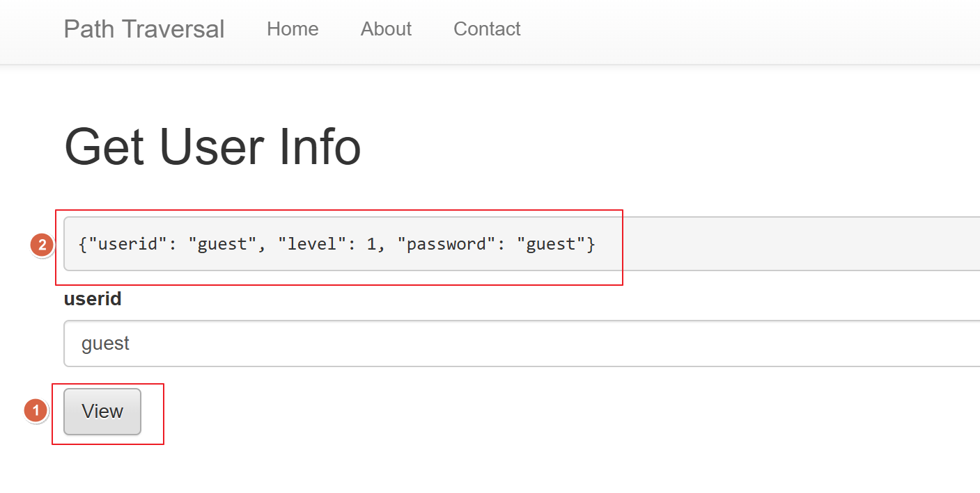 유저 정보를 가져오는 화면의 userid 값은 이미 guest로 채워져있다. 이때 1번 View를 클릭 할 시 2번의 내용처럼 guest 유저에 대한 정보를 가져온다.