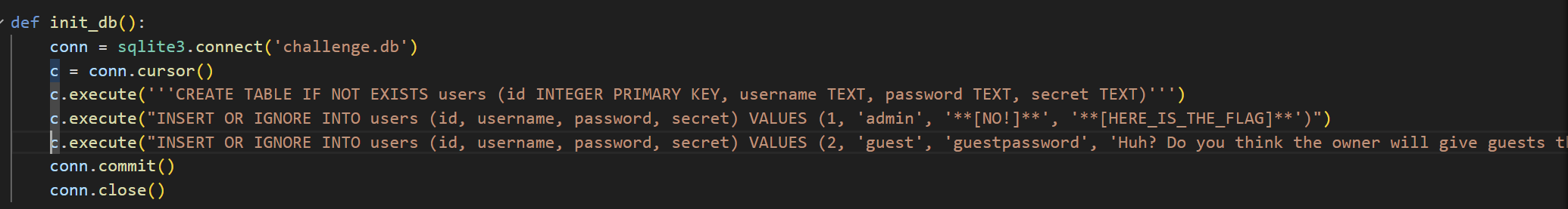 해석하자면 challege.db에 연결 후 admin 또는 guest라는 값이 존재할경우 무시, 존재하지 않을 경우 값을 Insert하는 db 명령이다.