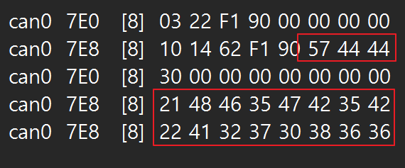 DID 값 (16진수) 설명 설명 세부 사항 F190 VIN (Vehicle Identification Number) 17자리 차량 식별 번호(VIN) F1A0 Supported Diagnostic Modes ECU가 지원하는 진단 모드 목록 F1C0 ECU Reset (Software Version) ECU의 소프트웨어 버전 정보 F1D0 ECU Serial Number ECU의 고유 시리얼 번호 F1E0 Hardware Number ECU의 하드웨어 번호 F1F0 Application Software Identification ECU 애플리케이션 소프트웨어 식별자 F200 Odometer Value 차량 주행 거리 (Odometer 값) F210 Engine Coolant Temperature 엔진 냉각수 온도 F220 Fuel Tank Level 연료 탱크 잔여량 F230 Engine RPM 엔진 회전수 (RPM) F240 Tire Pressure 타이어 압력 (개별 타이어 압력 값) F250 Battery Voltage 차량 배터리 전압 F260 Engine Oil Temperature 엔진 오일 온도 F270 Ambient Temperature 외기 온도 F280 Brake Fluid Level 브레이크 액체 잔여량 F290 Engine Load 엔진 부하 F2A0 Engine Oil Pressure 엔진 오일 압력 문제에서 확인 할 수 있는 HEX 값 F1 90은 VIN을 의미한다.