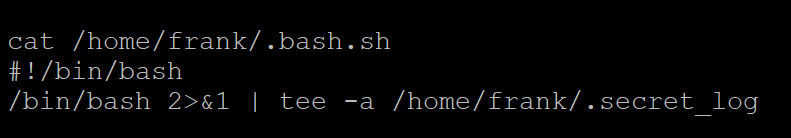 | tee -a 표준 출력을 tee 명령어에 전달하고 tee 명령어는 화면에 출력함과 동시에 -a 옵션을 통해 기존 내용을 지우지 않고 append 하며 /home/frank/.secret_log에 저장한다.