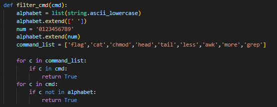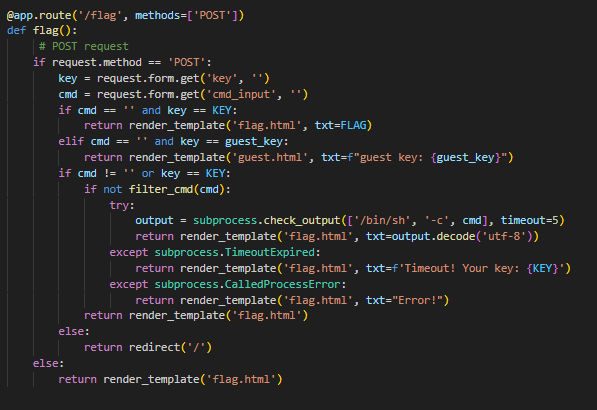 if cmd != '' or key == KEY:if not filter_cmd(cmd):try:output = subprocess.check_output(['/bin/sh', '-c', cmd], timeout=5)return render_template('flag.html', txt=output.decode('utf-8'))cmd가 빈 곳이 아니거나 key가 KEY일 경우에 if not filter_cmd, 즉 필터링에서 True값을 리턴 받지 않을 경우 해당 명령을 쉘로 실행한다.