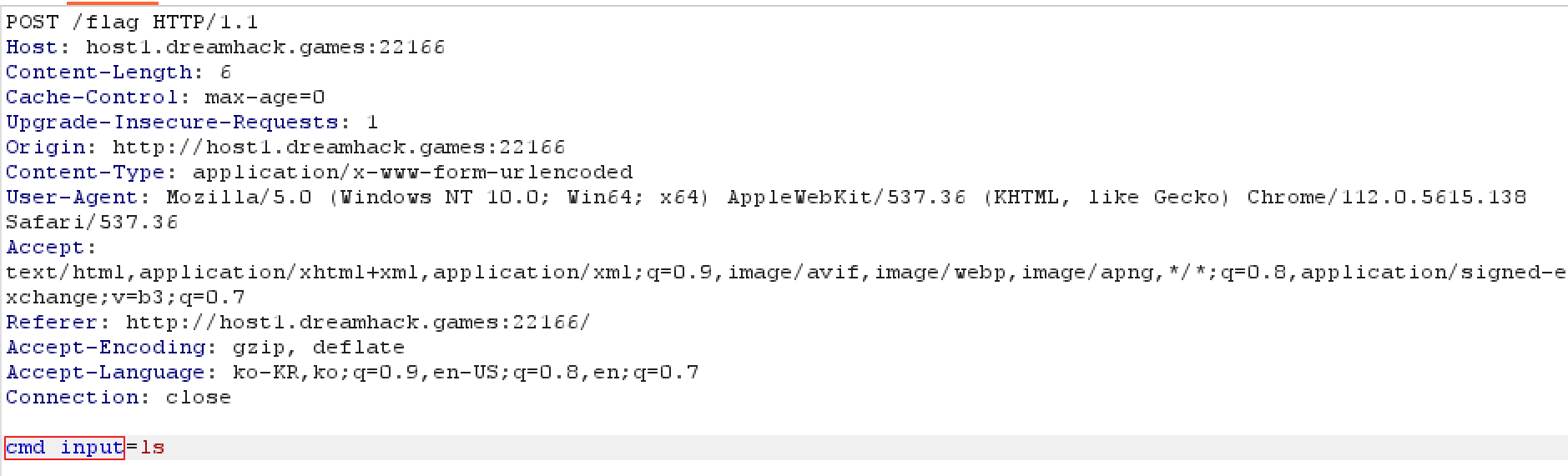여기서 중요한 것은 해당 POST 요청을 burp를 이용하여 캡쳐해 key를 cmd_input으로 변경해 cmd에 ls 값이 저장되도록 해야한다.