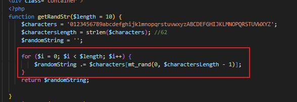 $characters에 저장되어 있는 0~9, a~z, A~Z 문자열을 랜덤 함수를 통해 랜덤하게 총 10자리까지 $randomstring에 저장한다.