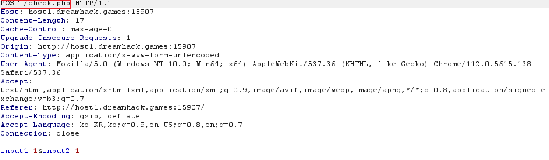 제출 버튼을 클릭 시 POST 요청을 통해 /check.php 파일이 동작하는 것을 확인 할 수 있다.
