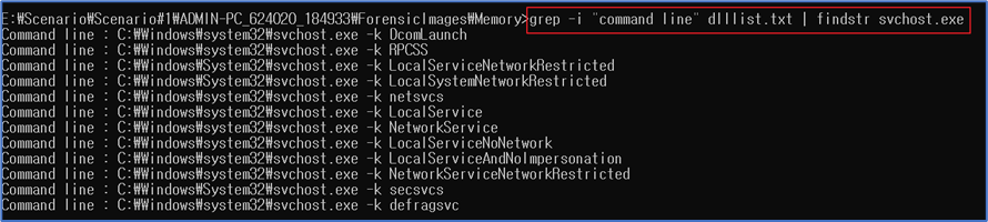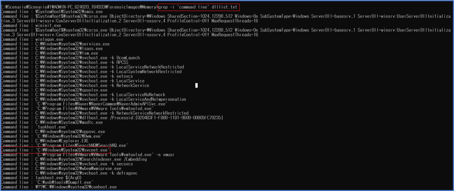 그렇기에 위 명령을 해석할 시 dlllist.txt 파일에서 command line 부분을 대소문자 구분 없이 추출하고 추출된 command line 부분에서 대소문자 구분 없이 windows, program files, systemroot 경로를 가지고 있는 것들을 제외시키고 출력시키라는 의미이다.