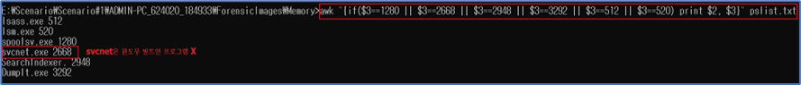 그림 2 인자 값 이상 유무 확인 인자 값이 없는 프로세스들 중 빌트인이 아닌 프로세스 확인 결과 svcnet.exe가 확인된다.