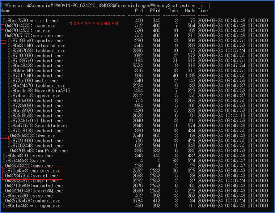 그림 8 N/A 프로세스 확인 위의 출력된 프로세스 중, 빌트인 프로세스, 덤프를 위해서 사용되는 DumpIt.exe를 제외하면 svcnet.exe가 의심되는 것을 다시 한번 확인 가능 하다.